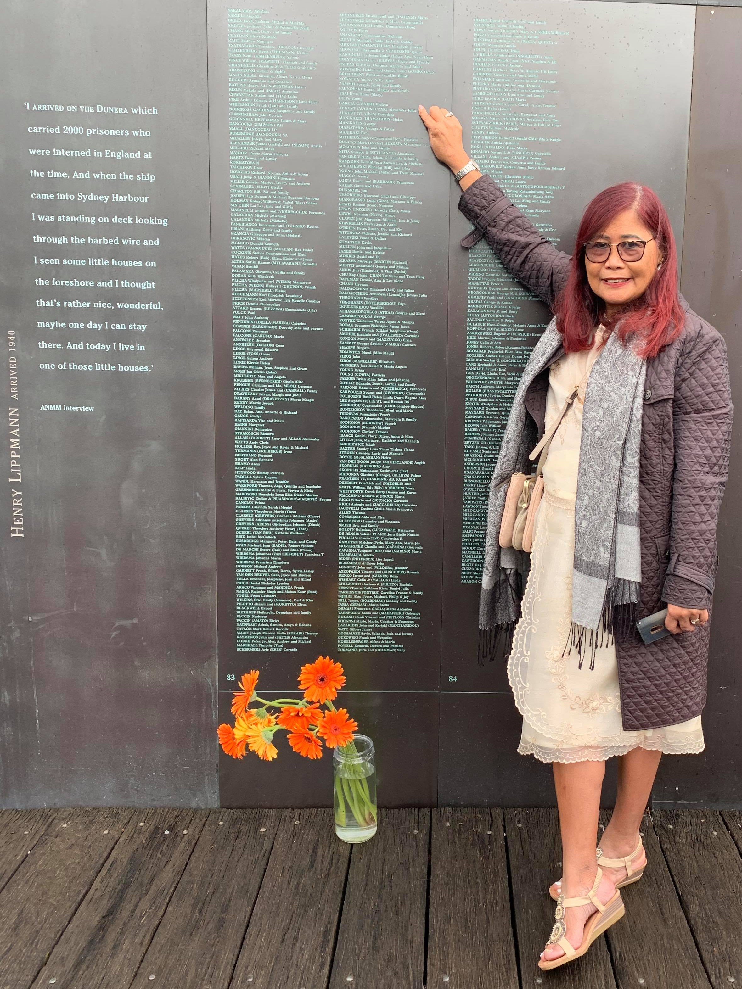 Subsequent enquiries revealed that there had been other Filipino-Australians who had been registered in the then Welcome Wall. In fact, much loved Ms Lolit Farmer OAM was one of the first ones to respond to the call. Her inscription appears on: Panel 1, Column 1, Line 11. Another two Fil-Aussies who were registered include Dr Zeny Edwards, with her inscription on Panel 23, Column 1, Line 9 and Evelyn de la Pena Redimerio in Panel 74, Column 2, Line 93.