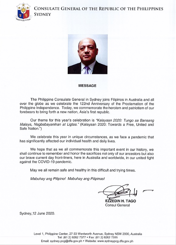 Despite not being physically together to celebrate the event, Filipinos have a greater appreciation of the significance of the occasion. The Filipino-Australian community is inspired in particular by the messages shared by the Philippine Ambassador to Australia, Her Excellency, Ma. Hellen De La Vega and the Consul General, the Hon. Ezzedin Tago.