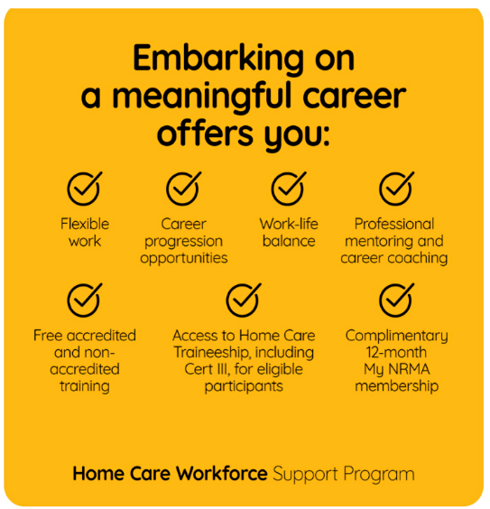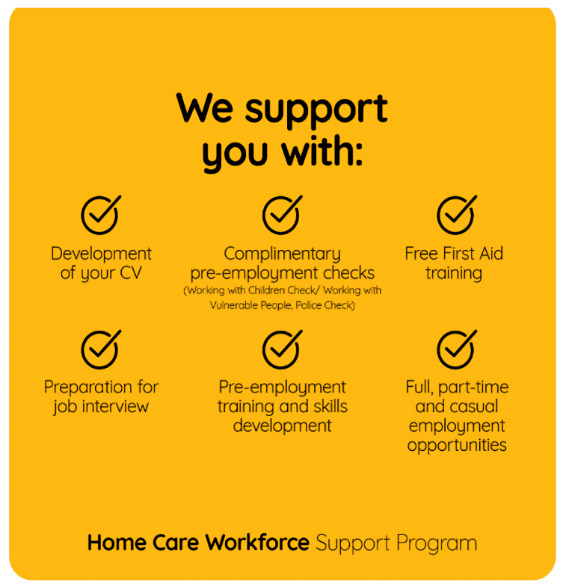 Working in home care provides a steady job that is meaningful and highly valued by clients. The work has flexible hours and is needed in almost every suburb in Sydney and right across NSW. The HCWSP provides support for new workers every step of the way; from connecting you with education providers and workplace training to helping you with all you need for job interviews to introducing you to employers.